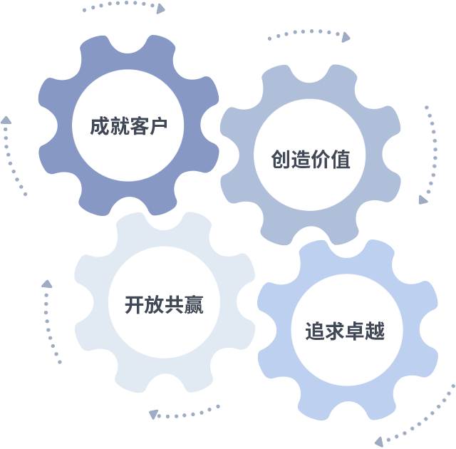 成就客户是一切决策的出发点,,创造价值是衡量所有工作的标准,,,追求卓越是我们做事做人的态度,,,,开放共赢是我们的格局也是最终的结果。。。。价值观的齿轮环环相扣,,,,推动着组织里的每个人不断向前。。